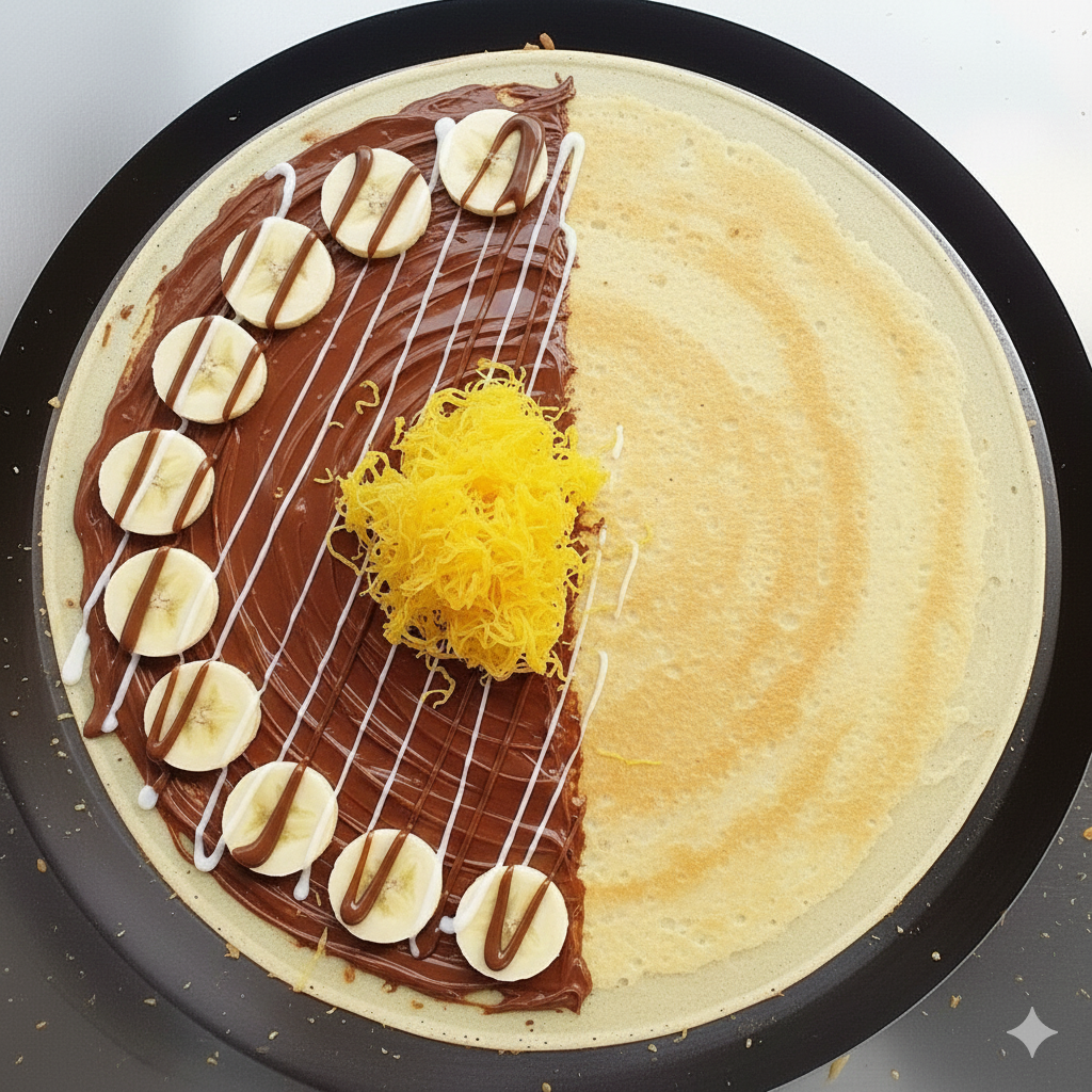 ทำไมถึงฮิต: การรวมตัวกันของช็อกโกแลตนูเทลลาเข้มข้น หอมมันกล้วย และความหวานละมุนของฝอยทอง ทำให้ไส้นี้เป็นอันดับหนึ่งในใจใครหลายคน เป็น เครปหวาน ที่พลาดไม่ได้!